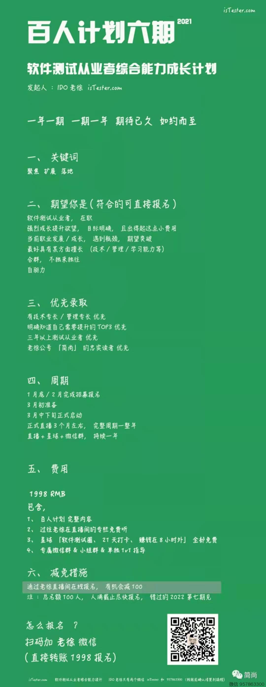 每年的百人计划,从关注老徐的近十万测试工程师中,招募100名想提升的,分布在全球(是的,每年都有海外华人测试工程师报名)各大企业的「在职软件测试工程师」,一起综合提升 。